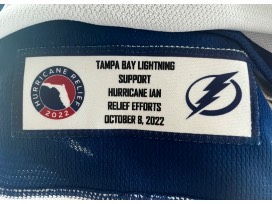 #88 Andrei Vasilevskiy authentic, game-worn jersey worn during the October 8th preseason game between the Tampa Bay Lightning and the Florida Panthers. Jersey includes a patch recognizing the Hurricane Ian relief efforts on the inside. Size 60G.