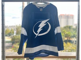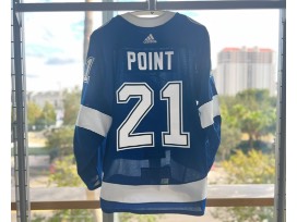 #21 Brayden Point authentic, game-worn jersey worn during the October 8th preseason game between the Tampa Bay Lightning and the Florida Panthers. Jersey includes a patch recognizing the Hurricane Ian relief efforts on the inside. Size 54.