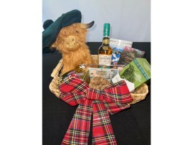 Glenlivet Scotch Whiskey, a can of Haggis, Stockan's Oat cakes, EdinburghTea, Edinburgh Rock Candy (soft & sweet candy made in Scotland), Handmade Scottish Vanilla Fudge, Scottish Sheep stuffed animal, Scottish Tam O'Shanter Hat, Wicker basket