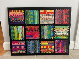 The 2nd grade students used only sharpie markers and popsicle sticks! This creative masterpiece will be a great addition to any room in the house. The canvas measures 16x20.