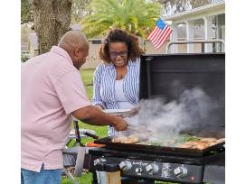 You will love the oversized 36" griddle size with sleek Culinary design! It has an XL 768 sq in cooking space with 60,000 BTU's and electric push button ignition. Already assembled, but does not include a propane tank.