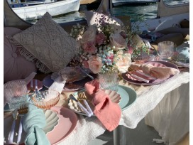 Plus the perfect addition of The Duffy Babe, Natalie Bradley. She will work with you to figure out your desired colors and theme to make your Duffy dreams come true! Includes place settings for each guest along with small floral arrangement and balloons on the Duffy. Pillows and small details included.