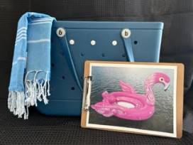 Oh yeah! Be the talk of the lake with this jumbo-sized, 6-person inflatable fanciful flamingo! Hours of memorable fun are bound to be had on this eye-catcher. Don't forget your new navy Bogg bag and two Turkish towels to boot!