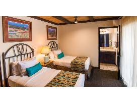 The master bedroom offers a King-size bed, TV, fireplace, and an attached master bath with large walk-in shower and separate jetted tub. The second bedroom includes 2 twin beds, and an attached bathroom with walk-in shower.