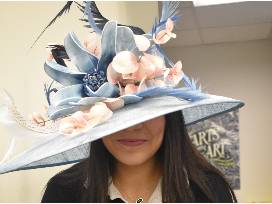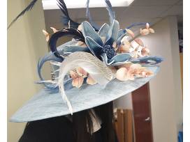 This beautiful blue and blush hat is perfect for any day at the track during Derby week or wear it to impress at your Derby party.