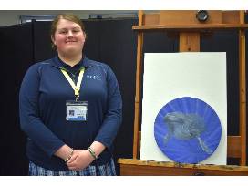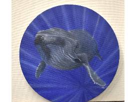 An oil painting of a humpback whale that is rising from the ocean through beams of light. Artist: Kylie McDaniel '25