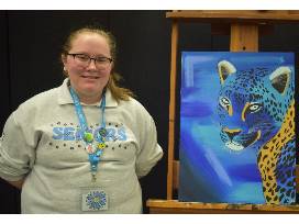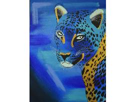 An acrylic jaguar with graphic quality on top of a mix of beautiful blues with highlights of white and gold. Artist: Sabina Rapp '24