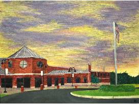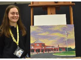 An oil painting showcasing the view of the Mercy building from the senior parking lot at sunset. Artist: Hannah Grosshans '25