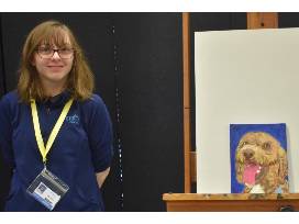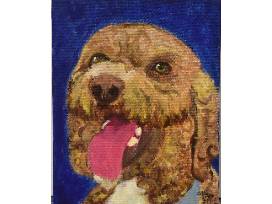 An oil painting on a small canvas picturing Mercy's therapy dog, Skye. Artist: Lilly Glazier '25