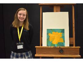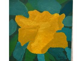 An oil painting on a small canvas depicting a beautiful yellow flower that represents Mercy Academy, accompanied by green leaves. Artist: Lilly Glazier '25