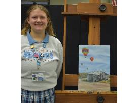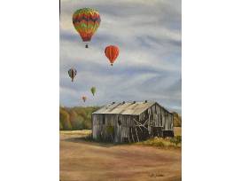 Oil painting of Kentucky farmland and old barn with hot air balloons floating overhead. This piece measures 12x18inches. Artist: Hadley Klusman '24