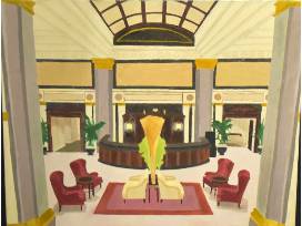 An oil painting on canvas of the lobby of the historic Seelbach hotel in Louisville. Artist: Jules Church '25