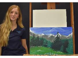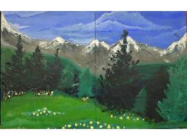 An acrylic piece of scenery across two canvases. Throughout the piece you will find different small details that show freedom, grace, and mercy. The yellow wild rose bushes show mercy, the birds in the top right show freedom, and the squirrel in the forest shows the grace of life. Artist: Georgia Paulley '25