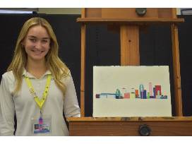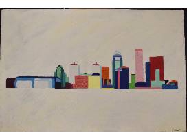 An acrylic and impasto piece on a wooden board depicting a simplistic Louisville skyline that is mapped out in colorful shapes. Artist: Caroline Cronen '25
