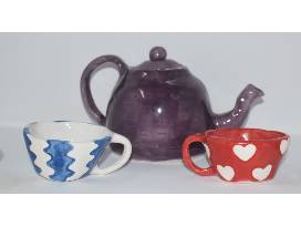 A ceramic tea set with cups glazed to represent Mercy class colors. The teapot is purple to represent all that faculty pour into their students. Artist: Savannah Steier '24