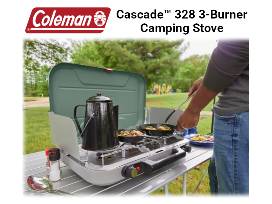 2. Coleman Cascade(TM) 328 3-Burner Camp Stove in Hickory Moss color. Retails at $200 and out of stock at most stores. Donated by Chris Leong. Features include: