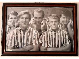 1. Framed Photo of The Beach Boys in 1964. 24" x 36". Photo order from left to right: Carl Wilson, Dennis Wilson, Mike Love, Al Jardine and Brian Wilson. Donated by Sam Watson.