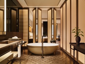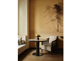 An invitation to switch-off from the outside world, each suite has a functioning fireplace as a central focal point, with a bedroom and living area separated from the bathroom by pivoting panels, allowing guests to tailor the room to their liking. Mood lighting and modern technology are integrated within the Japanese-inspired interiors, which include delicate ink-painted reproductions of Hasegawa Tohaku's murals.