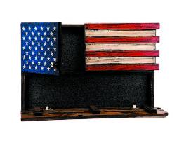 This American-made, wooden design shows Old Glory in all her beauty, but she holds a few secrets. This flag features not one, but two concealed locking compartments to secure any of your small belongings. From firearms to jewelry, this wall safe will protect your cherished possessions while showcasing your American pride. Hand painted and finished with a lacquer topcoat for years of beauty.