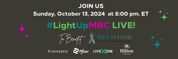 METAVIVOR RESEARCH AND SUPPORT, INCTune in to #LightUpMBC Live on METAvivor.org on 10/13 at 8 p.m. ET. To make a direct donation, please visit Donate,METAvivor.org/LightUpMBC to fund MBC research!