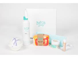 Buff City Soap bundle includes an Island Nectar soap bar, Lavender shower oil, coconut mini butter and blue soap sleeve