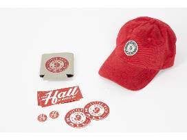 You will also receive The Hall branded merch including a koozie, hat, stickers and buttons.