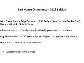 4 Wooden Bird-House Ornaments handmade by our very own President of the Denver Audubon Board of Directors and Audubon Master Birder, Curt Frankenfeld.