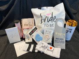A basket bursting with items for the Bride to Be! Once the wedding is over, there are still a few more fun trinkets for the new bride, including a $200 dry cleaning gift card to get the dress cleaned and stored.