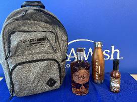 The Ultimate Gift Basket: Branded backpack with metal waterbottle, Merfs partnered hot sauce made with our 3 way Bourbon, 1 bottle of Batch 24 Flagship Bourbon, C92 Proof, 4 years old, small batch, made in homemade equipment with local grain and water