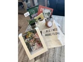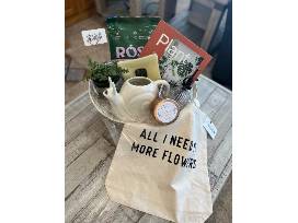 Bag of Soil, Plant Tribe Book, Plant Mister, Snail Watering Can, Candle, Silver Tears Pilea Plant, 5inch Pot, Tote Bag, Trinket Dish, & 2 Mother's Day Flower Box Vouchers for Historia Florals and a decorative glass plate by Jeri Webb.