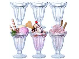 Comes with a 6 Pack of 6.7 Ounce Glass Tulip Sundae Cups, Clear Footed Dessert Bowls, and 6 Junket Ice Cream Mix Bundle - 2 Vanilla, 2 Chocolate, and 2 Strawberry.