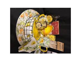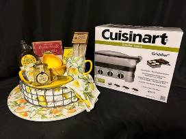 Enjoy a gourmet breakfast at home! This package includes a brand-new Cuisinart Griddler, mugs, an assortment of tableware, a lazy Susan, kitchen towels, pancake fixings, cookies, and honey spoons.
