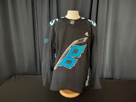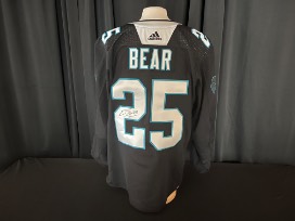 Former Carolina Hurricane Ethan Bear #25 warm-up worn Carolina Panthers Theme Night jersey worn on April 8, 2022 vs. the New York Islanders. Size 56. This jersey is signed.