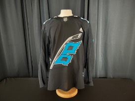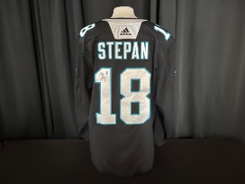 Derek Stepan #18 warm-up worn Carolina Panthers Theme Night jersey worn on April 8, 2022 vs. the New York Islanders. Size 56. This jersey is signed.