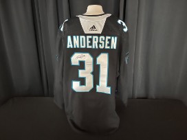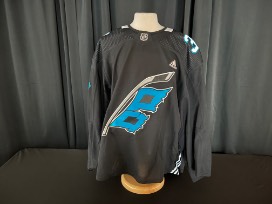 Frederik Andersen #31 warm-up worn Carolina Panthers Theme Night jersey worn on April 8, 2022 vs. the New York Islanders. Size 60G. This jersey is signed.
