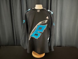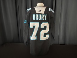 Jack Drury #72 player issued Carolina Panthers Theme Night jersey. Size 56. This jersey is signed with his current number, #18.
