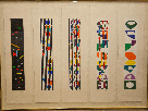 40x60 inches framed. Hand blocked serigraph. Very good condition. There are five individual pieces of paper throughout the work. Each with a different geometric design.