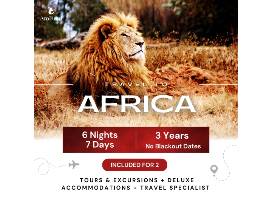 Welcome to your real life "Eden" where Mother Nature's exotic wildlife roam free and every morning you'll awaken to amazing sights and sounds inviting you to get up and explore! Your dreams will come true the moment you arrive at your luxurious lakefront safari camp nestled on the lush South African savannah tucked beneath majestic mountains. This amazing adventure includes a night in classic Johannesburg, five nights at your luxury safari lodge, four guided photo safari game drives, all your in-country transfers, 14 scrumptious meals, and memories that will last forever.