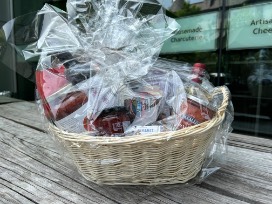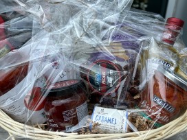 Basket includes pasta, organic pasta sauce, Peruvian pepper jam, bruschetta, extra virgin olive oil, wine, caramelized pecans, chocolate, and more!