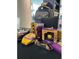 Package includes: Lakers Youth Foundation backpack, Lakers lunch tin, Lakers water bottle, Lakers motion sensing toy, Lakers Youth Foundation notebook, Lakers light up bracelet, Lakers Wilson basketball, Lakers Hardwood Classic mini basketball, Chick Hearn key-chain, Lakers pencil case, Lakers key-chain, Lakers Youth Foundation hat and Lakers World Champions Banner