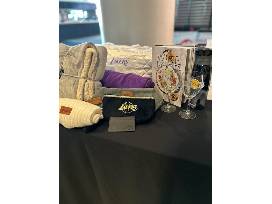 Package includes: Lakers tote bag, Lakers wine glasses, Wine & Food Cookbook, Lakers water bottle, Lakers scarf, Lakers blanket, Lakers Card holder Lakers clutch, Lakers toiletry bag, and Lakers beach towel