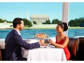Experience Washington, D.C. landmarks from a whole new perspective! A dinner cruise in Washington, D.C. does just that. Enjoy an upscale dinner cruise on the Potomac as you drift past iconic views like the Jefferson Memorial, Georgetown waterfront, and Lincoln Memorial. You and your guest can choose either a 2.5 hour or 3 hour dinner cruise on the Potomac River. The cruise includes a 3-course plated dinner with attentive tableside service and onboard entertainment with DJ music. A fabulous evening out!