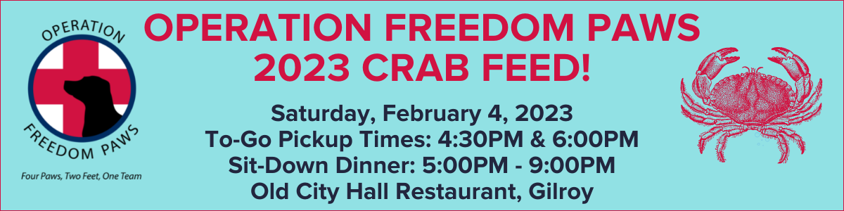 Enjoy a delicious crab feed to-go or join us in person for a sit-down dinner at Old City Hall Restaurant with an awesome live music, silent auction, and hidden treasure drawing in the spirit of our seafaring theme! All proceeds will go directly toward funding lifesaving service dog teams.