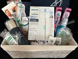 a Philips Sonicare Professional Toothbrush, a Thermos, Tote Bag, Umbrella, Med. Tee Shirt, Mouthwash, Toothpaste, Floss, Tooth Brushes, Tongue Cleaner, Hot/Cold Pak all in a Linen Lined Basket.