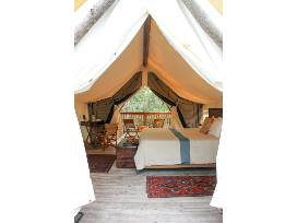 Nature meets luxury in our furnished tents, which are outfitted with hardwood floors, a plush king or double queen beds, a private tented porch with rocking chairs, battery-powered lanterns, and a writer's desk and chair.