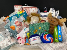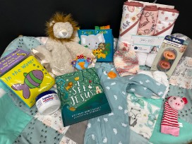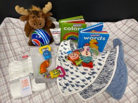 All the essentials you'll need for Baby including handmade soft quilt & blanket; sleeper, booties, onesies, bibs, books, toys, and more!