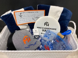 comes packaged in a beautiful white woven basket with two plush beach towels, four water-themed, stemless wine glasses, a frisbee and a cap!