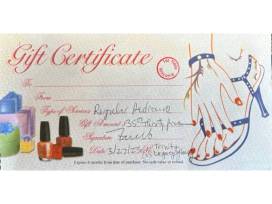 Time to get those toes ready for summer or maybe a special occasion!? Feel GREAT about pampering your own feet after an extra LOOOOONG winter OR gift this item to a bride-to-be, a fabulous teacher, or any special someone who could use a little "me-time"! Certificate good for one regular pedicure.