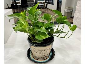 Inside the pot is a beautiful Marble Queen Pothos which will instantly liven up any room with its lime-colored stems and bright green variegated heart-shaped leaves. Caring for this plant is easy. It prefers bright indirect or medium light, moist but well-draining soil, and monthly fertilizing during the growing season. It also benefits from high humidity, which can be achieved by wiping its foliage with a damp cloth or placing it on a pebble tray!