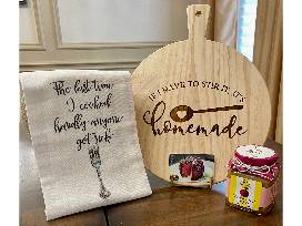 Included in this package is a funny cutting board, Kitchen towel, pomegranate creme, 2 tickets to see Brother Toad at Ensemble Theatre on May 18th, 25th or June 1st and a gift card to Ruth's Chris.